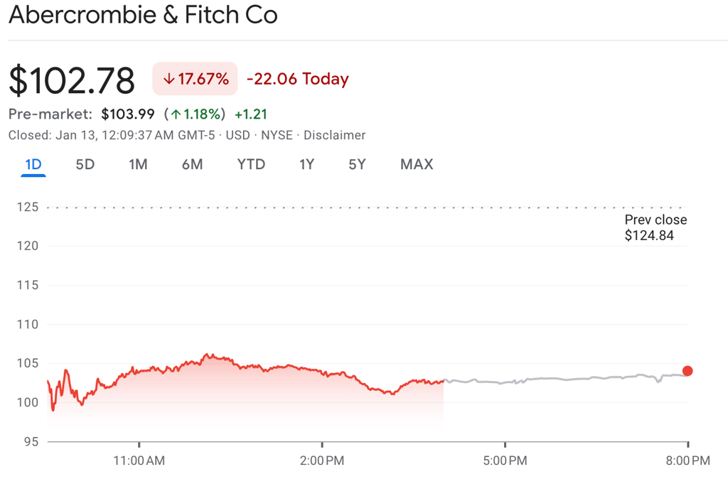 Abercrombie & Fitch (ANF) 股价大幅下跌,此前该公司发布了假日季业绩更新,但远低于市场此前的强劲预期。ANF 股票最新交易价格约为 102.78 美元,下跌约 22.06 美元,较前一交易日收盘价下跌约 17.67%。